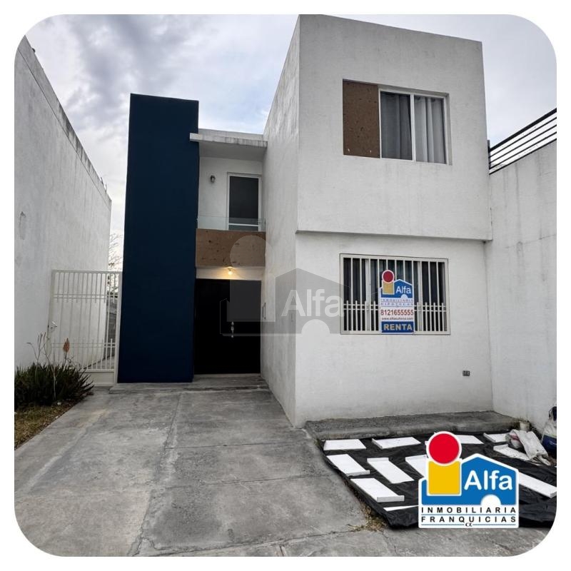 Casa en Renta en Valle de la Rioja en Sector Galicia en Zona de Apodaca, planta baja con cocina integral con estufa y refrigerador, ante-comedor con cuatro sillas, patio con lavadora y boiler, sala, baño completo, planta alta con tres recamaras, principal con cama matrimonial. mini split, recamaras secundarias cada una con cama individual y sus interiores de closet, baño completo. cochera par un auto, completamente nueva y para estrenar, colonia privada, con caseta de vigilancia, áreas verdes, cercana avenidas principales, centros de trabajo cercanos incluido el pago de mantenimiento.